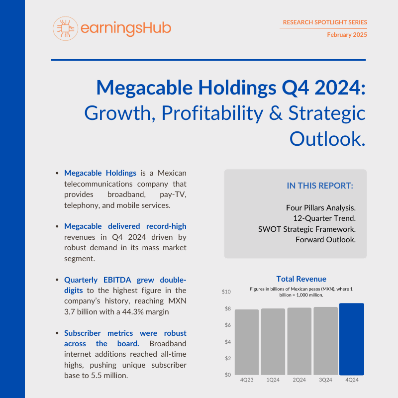 Inside, you'll find: 📊 Revenue Growth: All-time high revenues of MXN 8.5 billion (+8% YoY) driven by mass-market expansion. 💰 Profitability Surge: EBITDA reaches a record MXN 3.7 billion, marking the highest margin in the company’s history. 📈 Subscriber Boom: Broadband customers hit 5.5 million, with all-time high additions. 📉 Cash Flow & Investments: Capex moderates, free cash flow turns positive for the first time in years. 🔍 Strategic SWOT & Outlook: Competitive landscape, key risks, and the company’s roadmap for 2025.